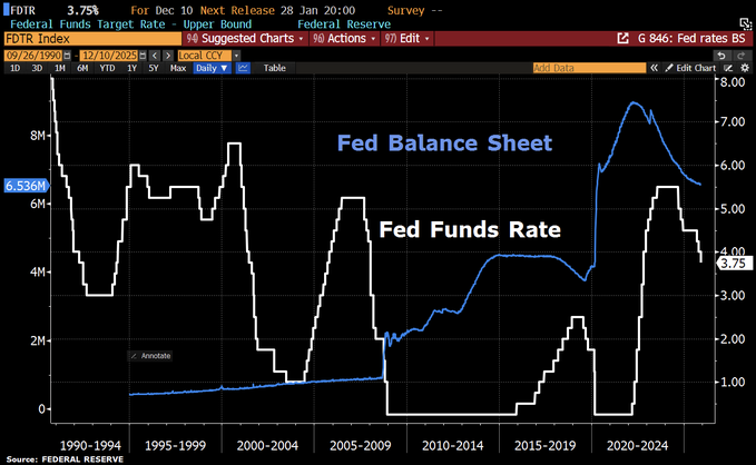 10月,随着部分金融机构大规模动用美联储常设回购便利(SRF)工具——该工具提供以国债和抵押贷款债券为抵押的快速贷款,关键货币市场利率开始攀升,这预示着对联邦基金利率的潜在失控风险,也最终促使了美联储在上次会议上宣布终止QT(于12月1日执行)。