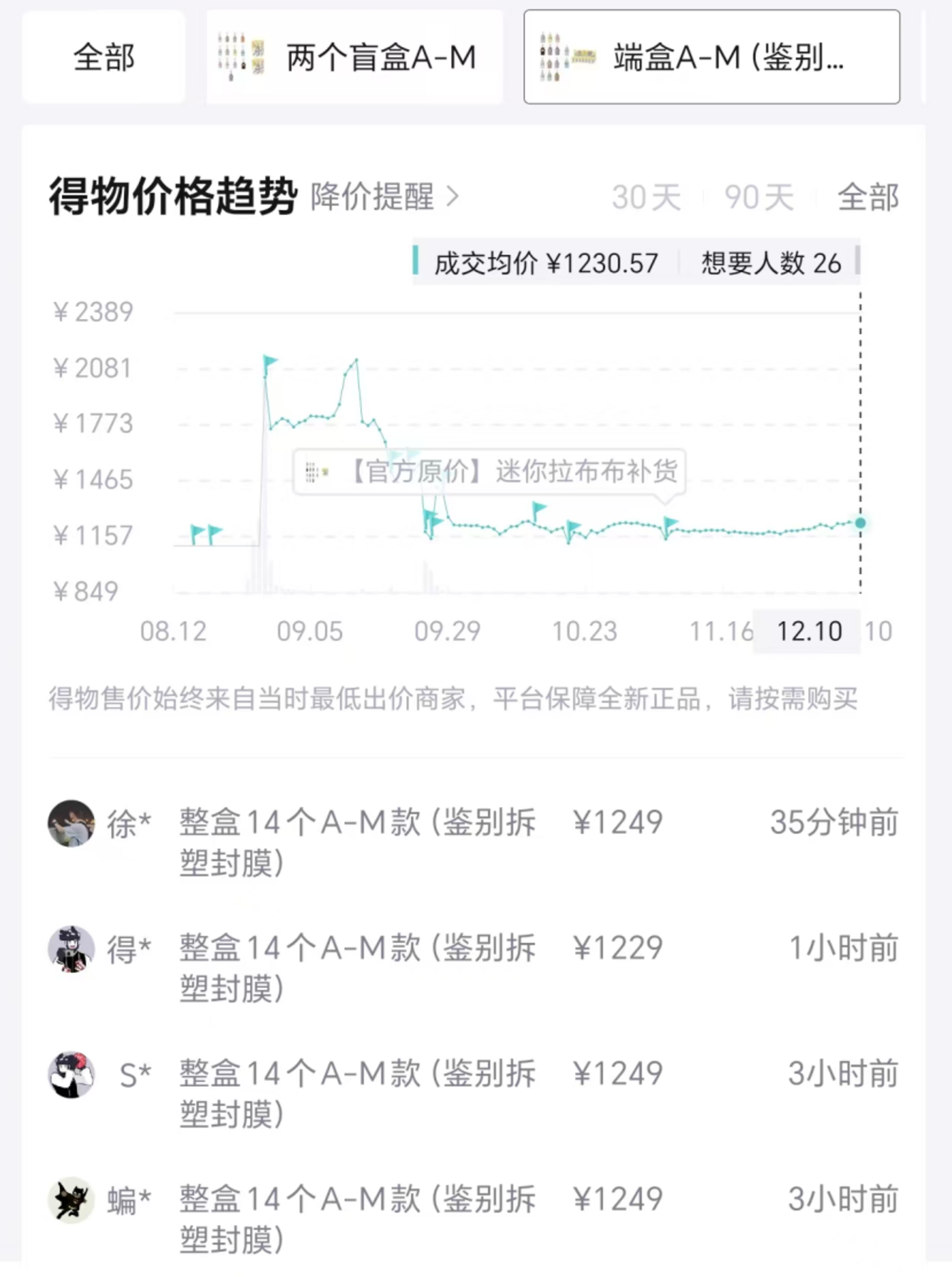 仅从二手市场表现上看,Labubu的价格确实在下跌。以三季度发售的迷你版Labubu为例,9月时该系列整盒14款(A-M)的价格一度达到2000元以上,如今价格已回落至1230元左右,跌幅逾40%。其余款式Labubu产品的价格表现也与之相似。